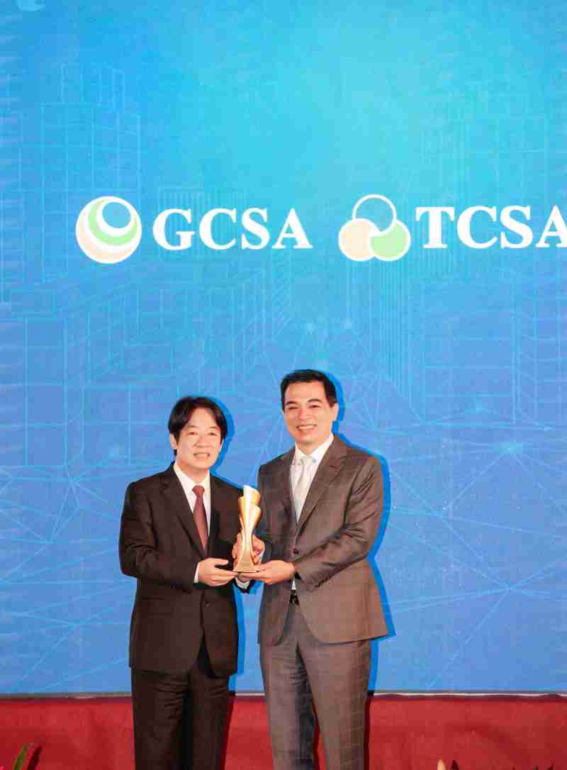 达全方位永续表现获全球永续奖及台湾永续奖肯定,,,,由副总统赖清德颁奖 (左),,,杏悦2总经理柯富仁 (右) 代表领奖