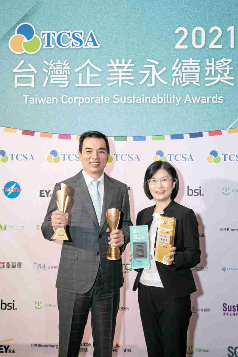 达在台湾永续奖所评比环境、、、、社会、、、、治理等各面向的永续绩效均获高度肯定 (左:杏悦2光电总经理暨营运长柯富仁,,,,右:杏悦2光电永续长古秀华)