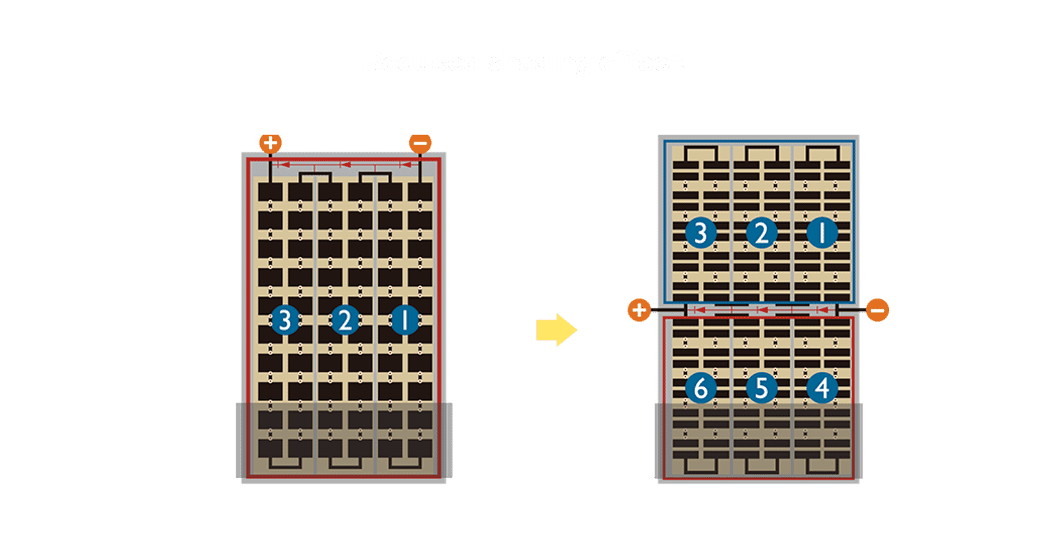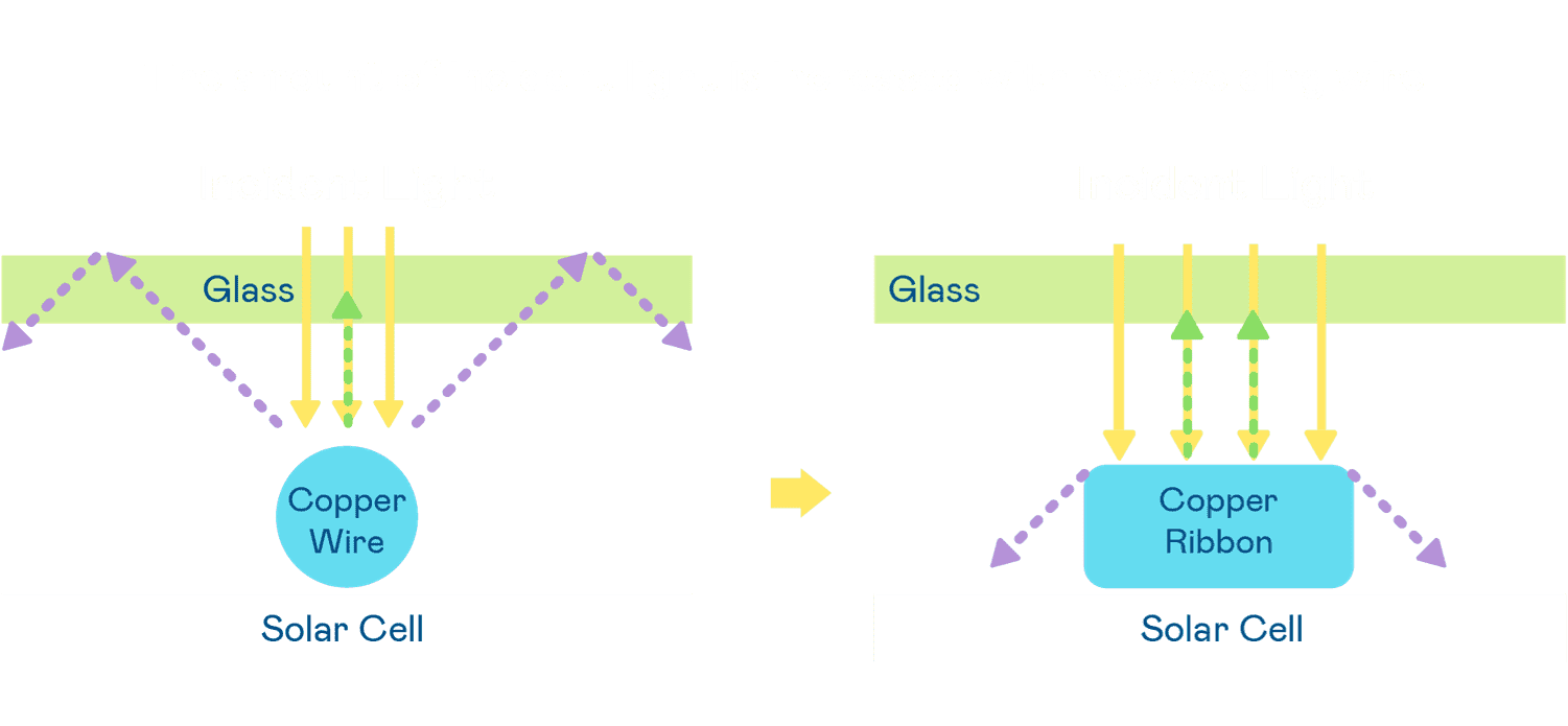 - 电池使用多条铜导线 (Copper wire) 于电池片上形成较短的电流路径,,,,提高电流收集效率,,采用圆形设计的铜导线较传统扁平式的铜焊带 (Ribbon),,可增加入射至电池的光线量。。。。