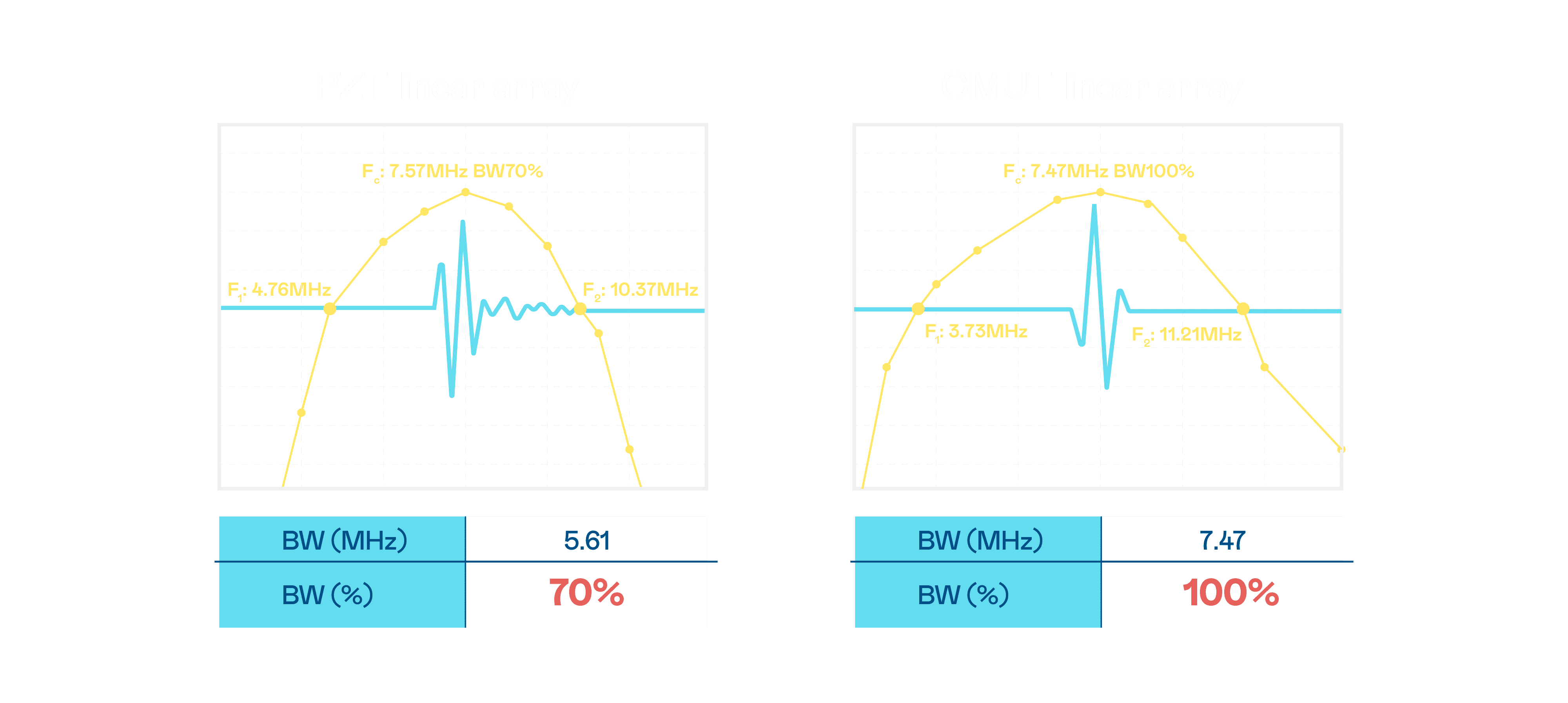 超音波影像的解析度高低,,,,首先取决于探头能发出的讯号频宽。。杏悦2 CMUT 可提供高清晰的超音波讯号,,提供高频宽、、、、高灵敏度、、、、影像纹理细节更高的超音波影像,,,,协助医护人员缩短影像判读时间及利用精准的医疗影像进行诊断。。。